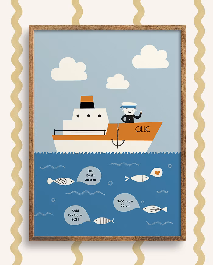 Ohoj Retroinspirerat print med barnets födelseinformation.Välj mellan långt eller kort hår på barnet.Barnets förnamn sätts på båten.Texten i pratbubblorna är valfri – fyll i det du vill!Ram ingår ej. 299:- Storlek 30x40 40x50 50x70 70x100 Färg Blå Rosa Köp